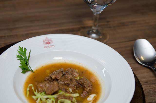 Gerentes da SANEPAR que integram a Turma Liderança de Líderes do Programa CAGE, desenvolvido pela Educação Executiva da Escola de Negócios da PUCPR, participaram da Oficina Gastronômica no último dia 20 de março de 2015. A Oficina faz parte do Ciclo didático Vivencial, desenhado pelo professor Marciano Cunha, coordenador do CAGE. Durante 8h intensivas de trabalho a turma composta por 32 gerentes pode vivenciar uma "Deliciosa Experiência" de desenvolvimento pessoal e profissional utilizando a linguagem gastronômica para discutir processos de comunicação e planejamento. A parte técnica da oficina foi conduzida pelo professor e Chef de Cuisine Alexandre Dhein, coordenador do curso de Gastronomia da PUCPR. O cardápio desenvolvido pelos participantes foi customizado pelo professor Alexandre e teve como conceito a Páscoa Judaica.